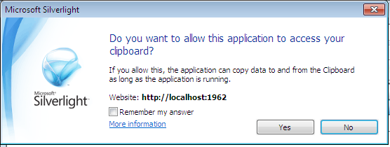 If the app is running out-of-browser with elevated trust, the above dialog is not shown and the Clipboard methods can be called even if not in response to user initiated events such as in your page constructor, in a DispatcherTimer.Tick event, etc.