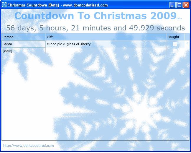 Countdown To Christmas 2009 Silverlight 3 app 30 October 2009 (0) For a bit of Silverlight 3 fun: Use\install at: http://www.dontcodetired.com/live/christmascountdownbeta/ There are some things which need improving such as resizing when run out of browser, abilty to sort/hide/filter data etc. SHARE: