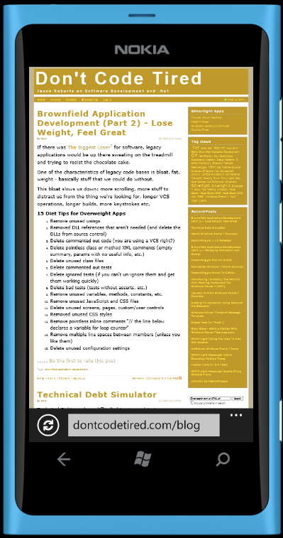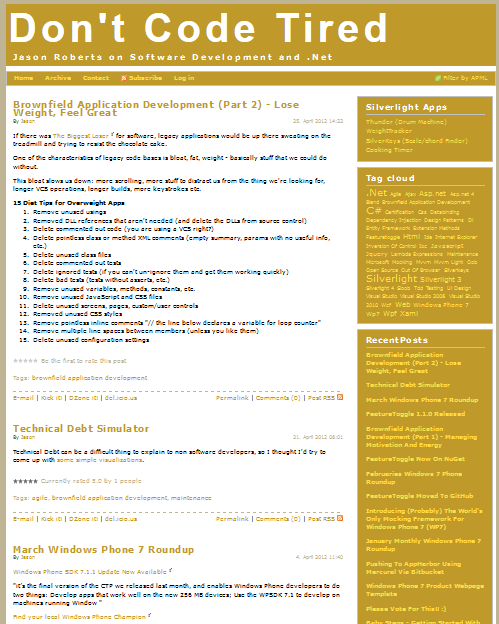 DontCodeTired is looking tired and boring, it also sucks when viewed on a mobile phone, hence I've decided to do a redesign. I am not a designer, if I was willing to pay for a designer (and I knew where to find one) I may have decided to use one. Certainly for a commercial project I would push heavily for a professional designer to be employed.