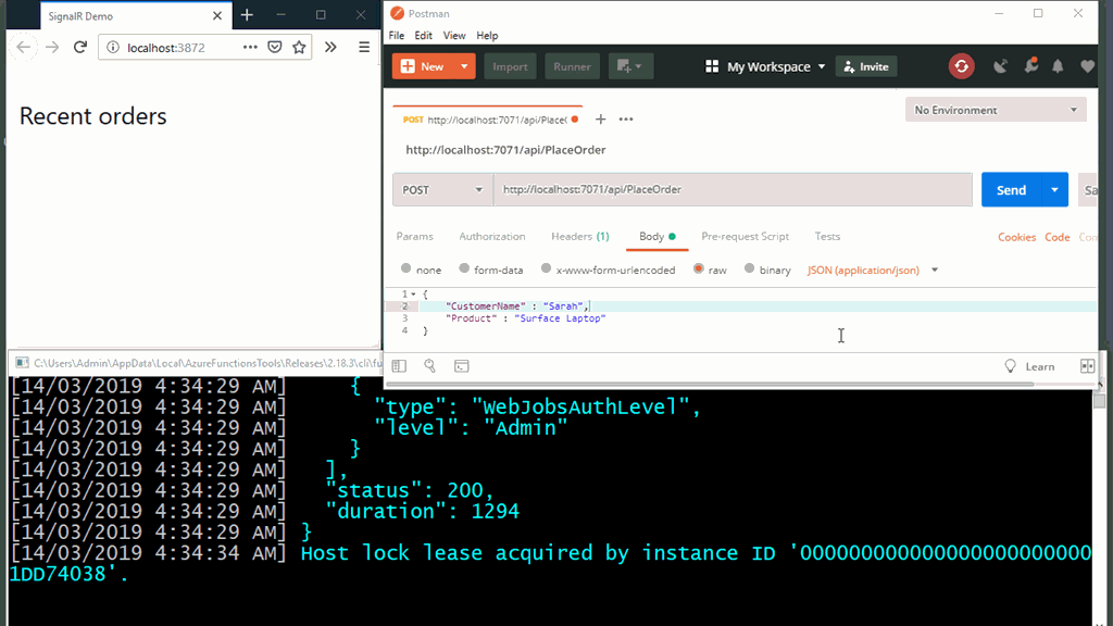 Once both projects are running you should be able to post some JSON to the PlaceOrder function HTTP endpoint (for example using Postman) containing the CustomerName and Product: