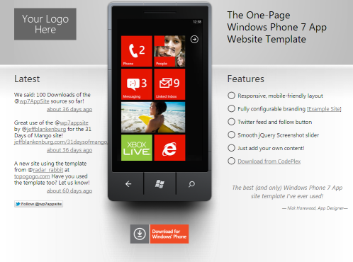 Windows Phone 7 Product Webpage Template 22 January 2012 (0) If you want a quick way to create a product page for your Windows 7 App, this is a nice starter page by Nick Harewood. View a live sample or get more info and download. SHARE: